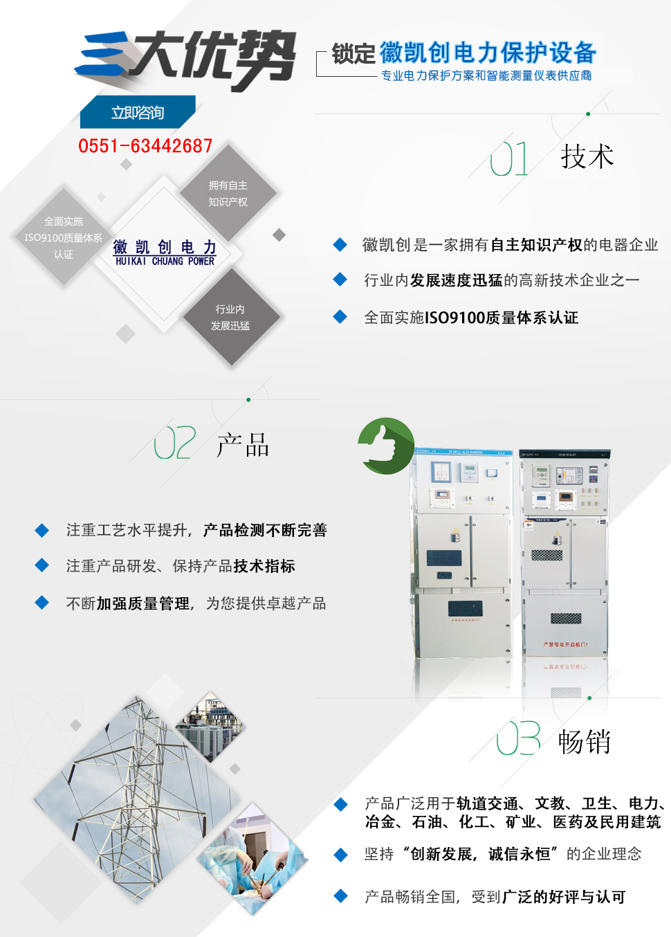 安徽徽凱創(chuàng)電力保護(hù)設(shè)備有限公司主要從事新型電氣設(shè)備、電子設(shè)備、智能控制技術(shù)的產(chǎn)品研發(fā)、生產(chǎn)、銷售。主要產(chǎn)品有:智能型消弧消諧裝置、消諧過(guò)電壓抑制柜、 組合式過(guò)電壓保護(hù)、智能型開關(guān)柜智能操控裝置、微機(jī)消諧、小電流選線、電弧光保護(hù)裝置、智能在線絕緣監(jiān)測(cè)裝置等電氣產(chǎn)品。 產(chǎn)品廣泛用于石化、煤炭、電力、建筑、市政、機(jī)場(chǎng)、鐵路、醫(yī)院、學(xué)校等領(lǐng)域,受到用戶一致好評(píng)。